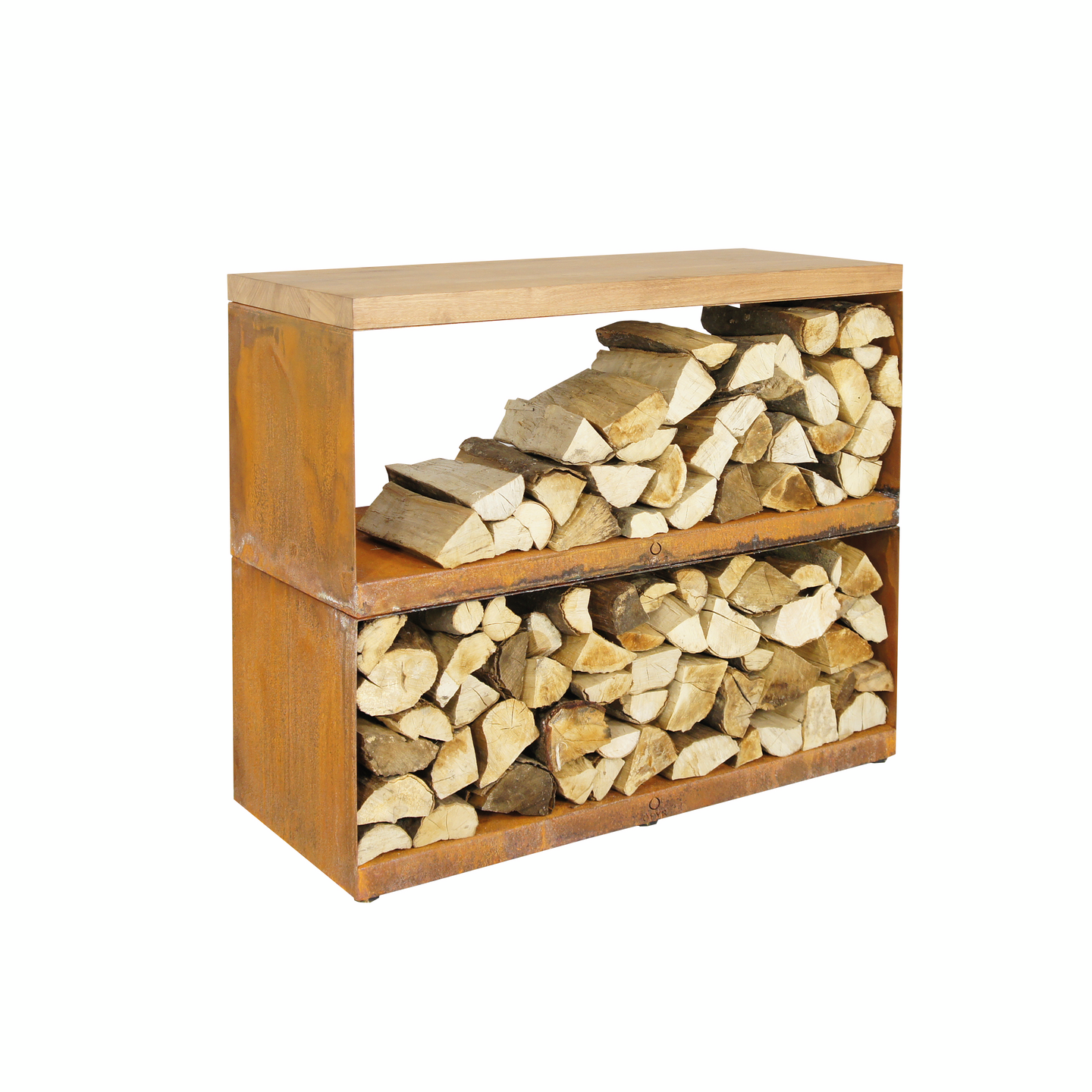 Hylly OFYR wood storage Corten dressoir tiikki tasolla