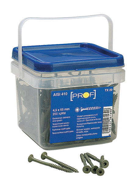 Hanki kestävät terassiruuvit terassin rakentamiseen K-Raudasta. Valikoimistamme löytyy ruostumattomia A2-, A4- ja AISI410-terassiruuveja. Ruostumattomat AISI410-terassiruuvit ovat muista ruostumattomista terassiruuveista poiketen magneettisia. Karkaisun ansiosta AISI410-materiaalista tehdyt ruuvit ovat kovempia kuin A2-ruuvit, mikä parantaa niiden avainkolon kestoa. A2 alttiiseen ympäristöön, A4 merivesiympäristöön