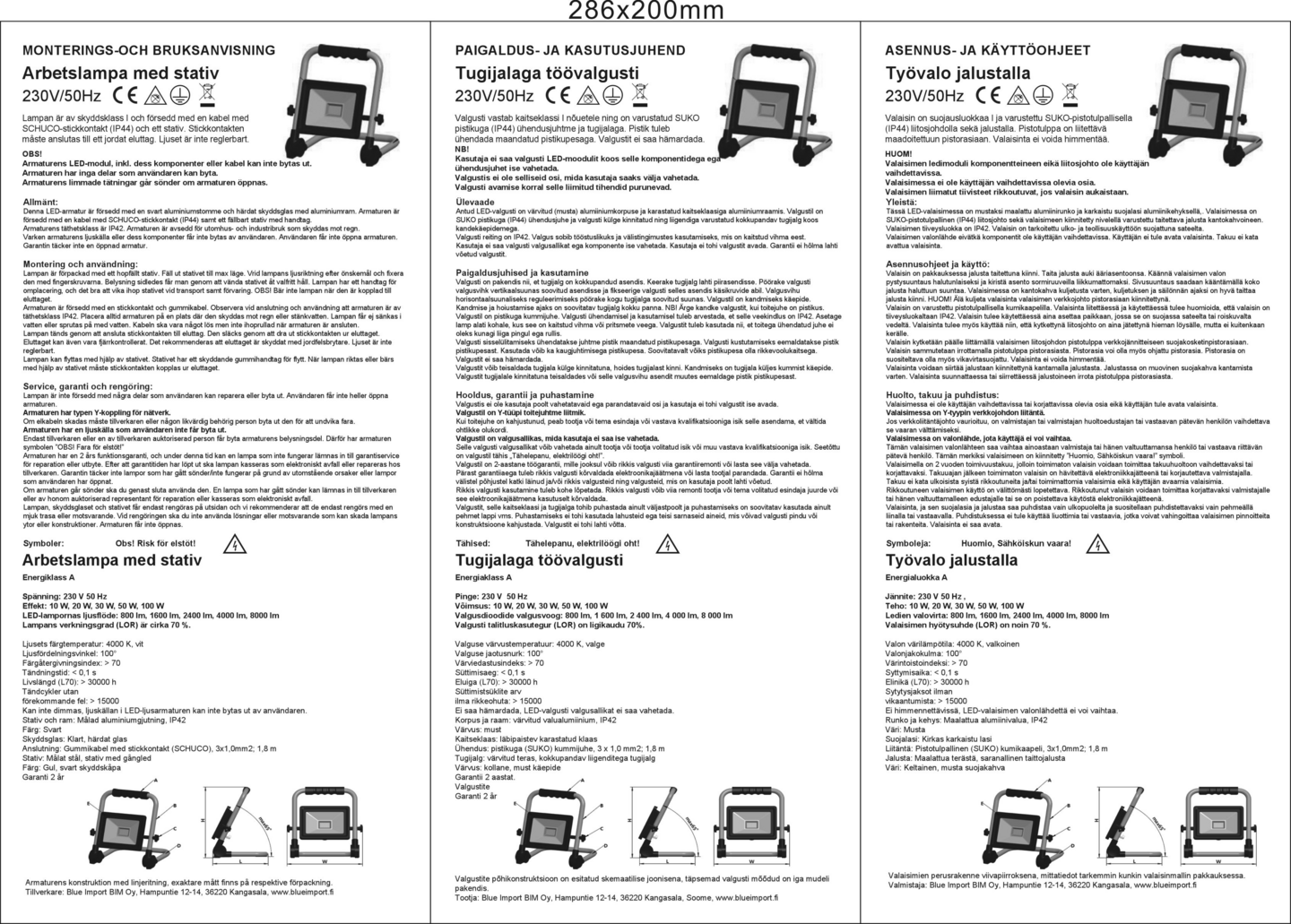 Tehokas 100 W työvalaisin jalustalla, sopii mainiosti sisällä ja ulkona työskentelyyn. 7500 lm valovirta, mukana 1,8 metrin liitäntäjohto. Tuotteen mitat: 44,5 x 40 x 7,5 cm.