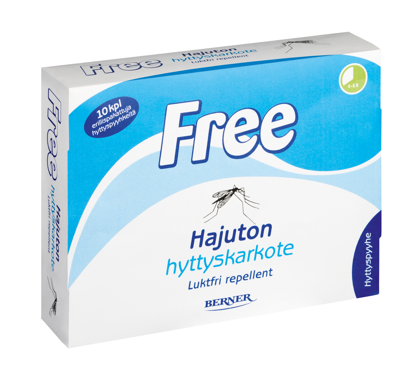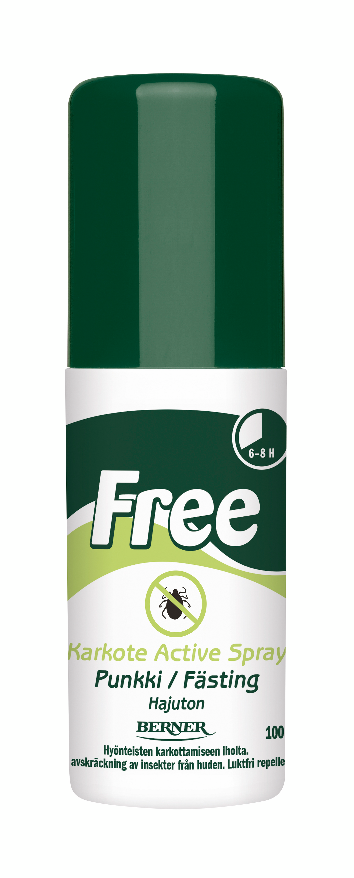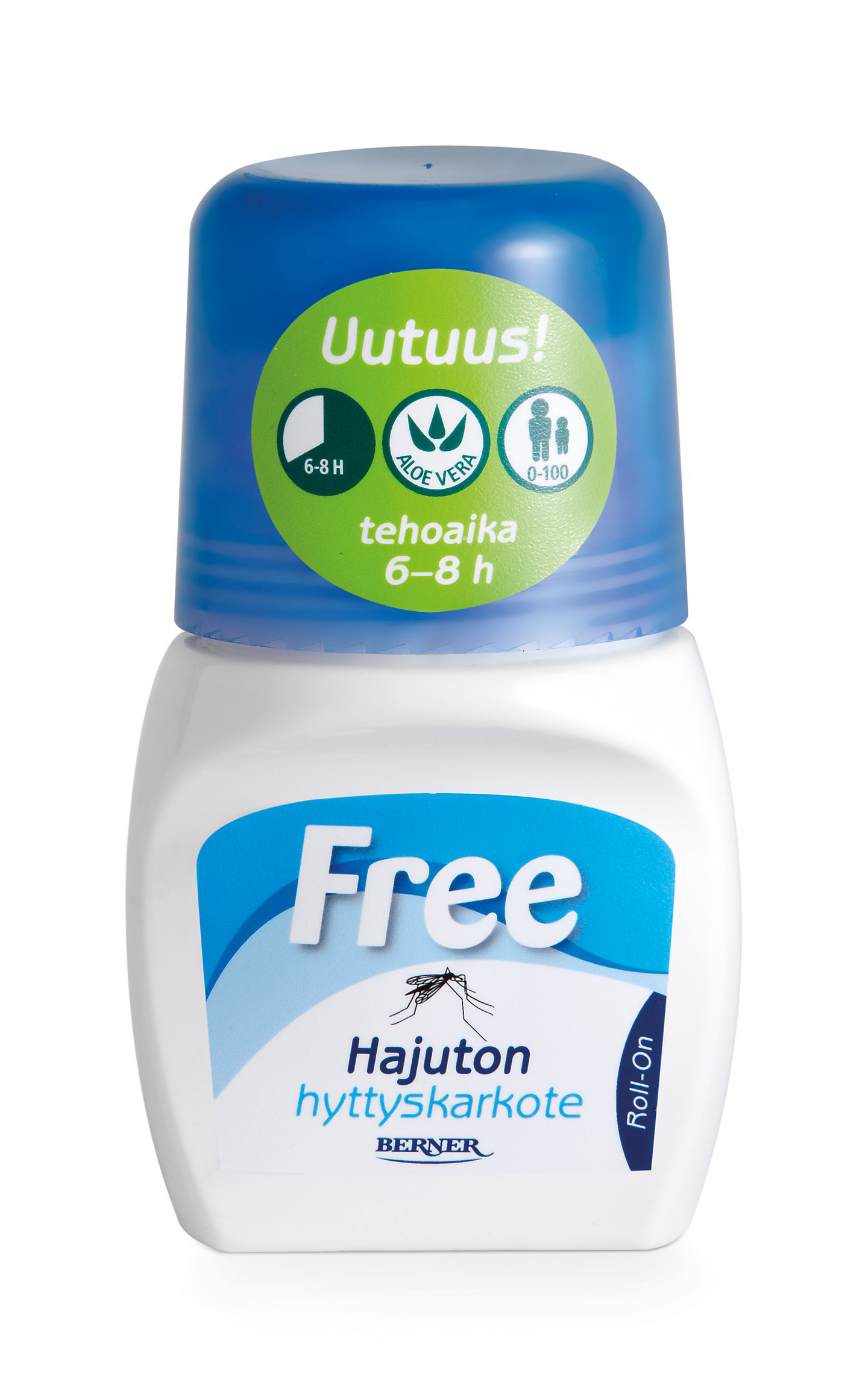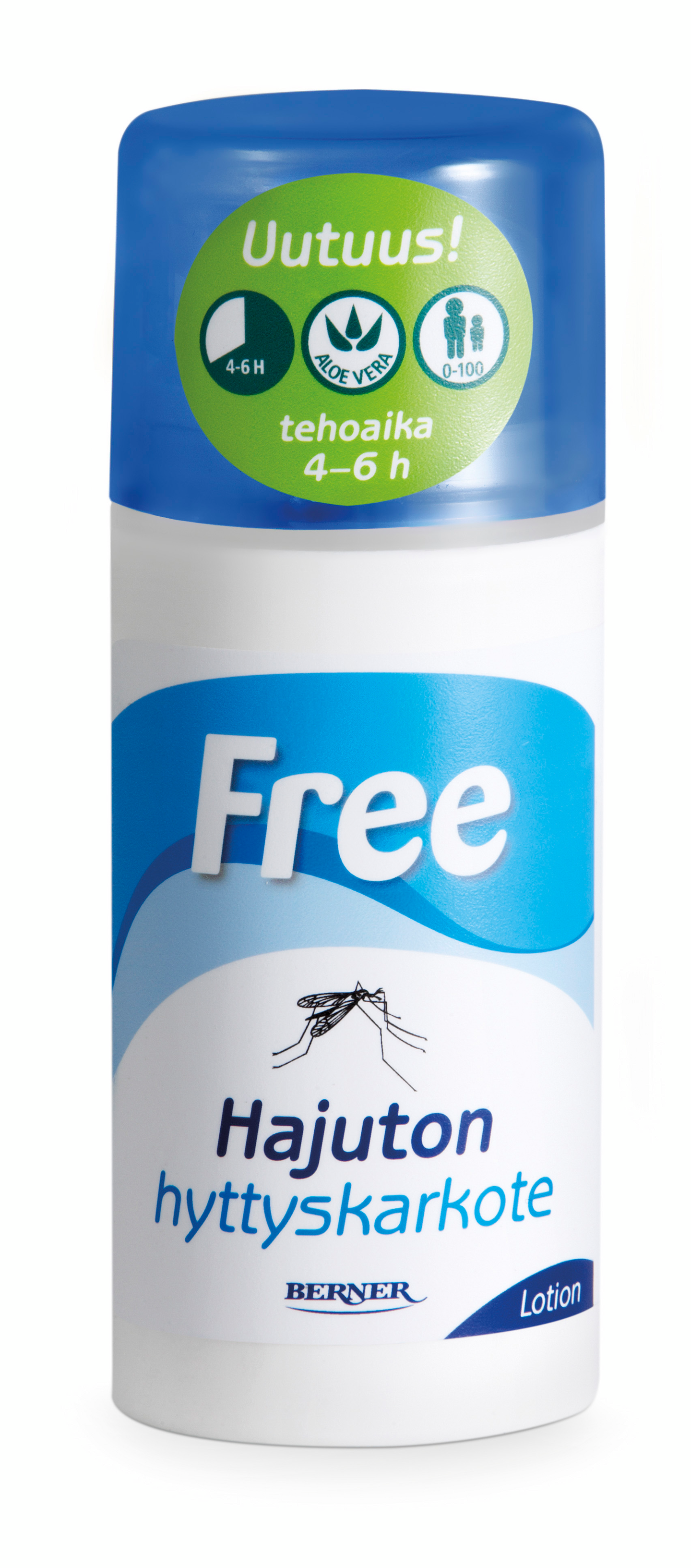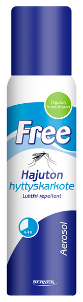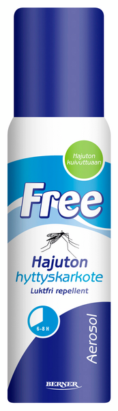 Free-hyttyskarkote on yhtä tehokas kuin perinteiset hyttyskarkotteet, mutta kehittyneemmän aktiiviaineen ansiosta täysin hajuton. Free karkottaa hyttysten lisäksi myös mäkäräiset ja punkit antamalla suojaa jopa kahdeksaksi tunniksi. Free-hyttyskarkotteen teho perustuu uudenlaiseen aktiiviaineeseen (IR 3535), joka on lääkeyrityksen kehittämä ja maailman terveysjärjestön WHO:n suosittelema. Iholle hellävaraisena Free sopii hyvin myös pienille lapsille.